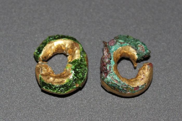 Gold-covered hair ornaments of a similar date have also been found, such as these rings from Sculptor’s Cave on the shore of the Moray Firth, which now reside in Elgin Museum. Although these ones seem to be related to some of the human remains found at the site, that’s not the case for all 26 hair rings which have been found in Scotland. It’s been argued that people wore them during their lifetime “as a way of showing off the wealth and status of their high-ranking owner. The wear seen on the inside of the hoop is consistent with this.”