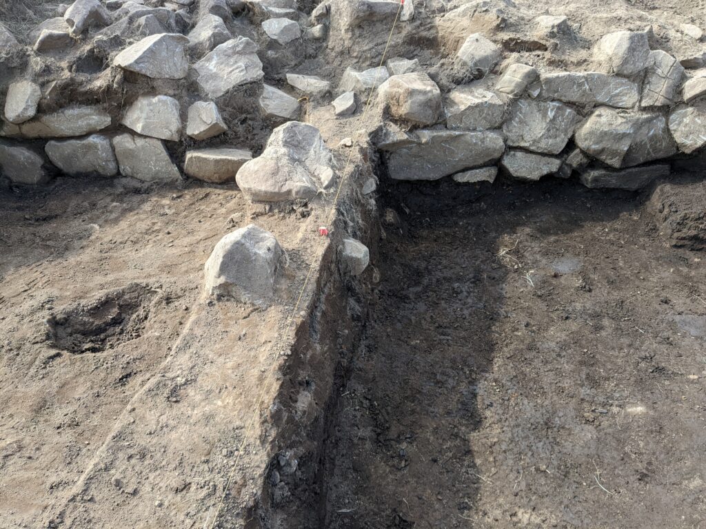 It took a few patient days of digging in very windy conditions to reach the underground wall, clear away debris, and identify the inner and outer faces of the wall, but the team were successful. They opened two trenches on different parts of the hillside, in which they also made some unexpected discoveries.